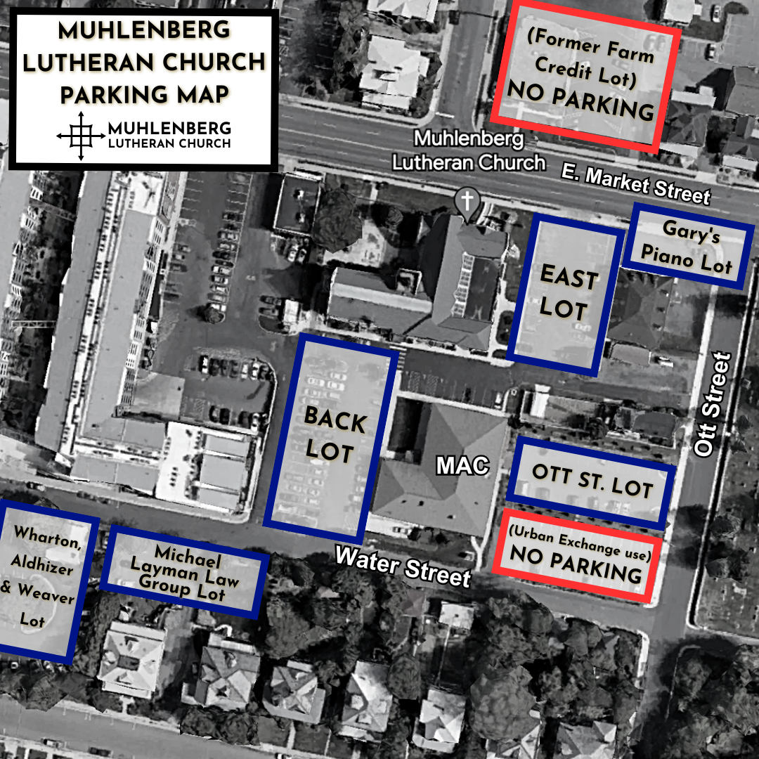 Parking can be tight! Please take a look at the map below to help you navigate where to park as you prepare to worship with us. *NOTE - the “Farm Credit Lot” is now off-limits for Muhlenberg parking.