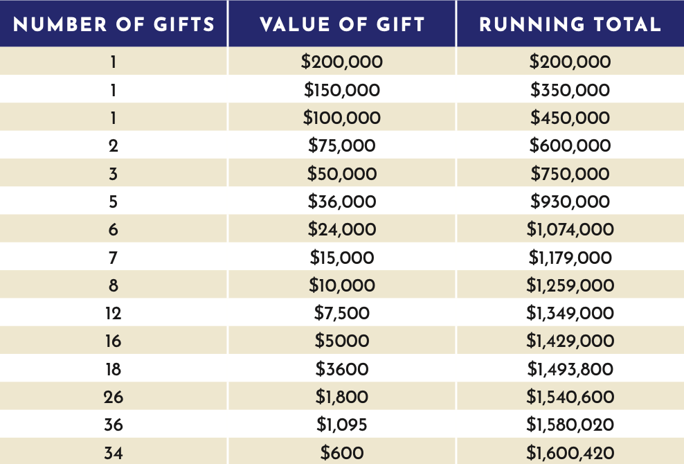 A: You will be asked to prayerfully consider an amount based on the gift chart to reach our goals. A fulfillment of every gift listed on the chart will allow us to meet our goal.